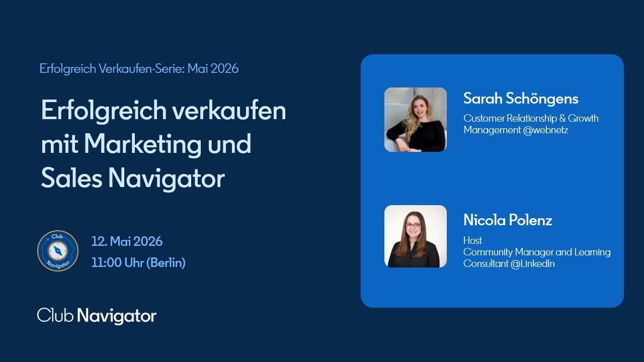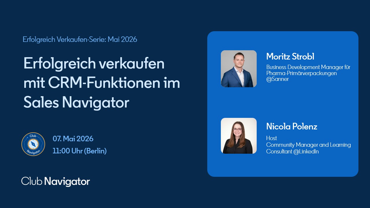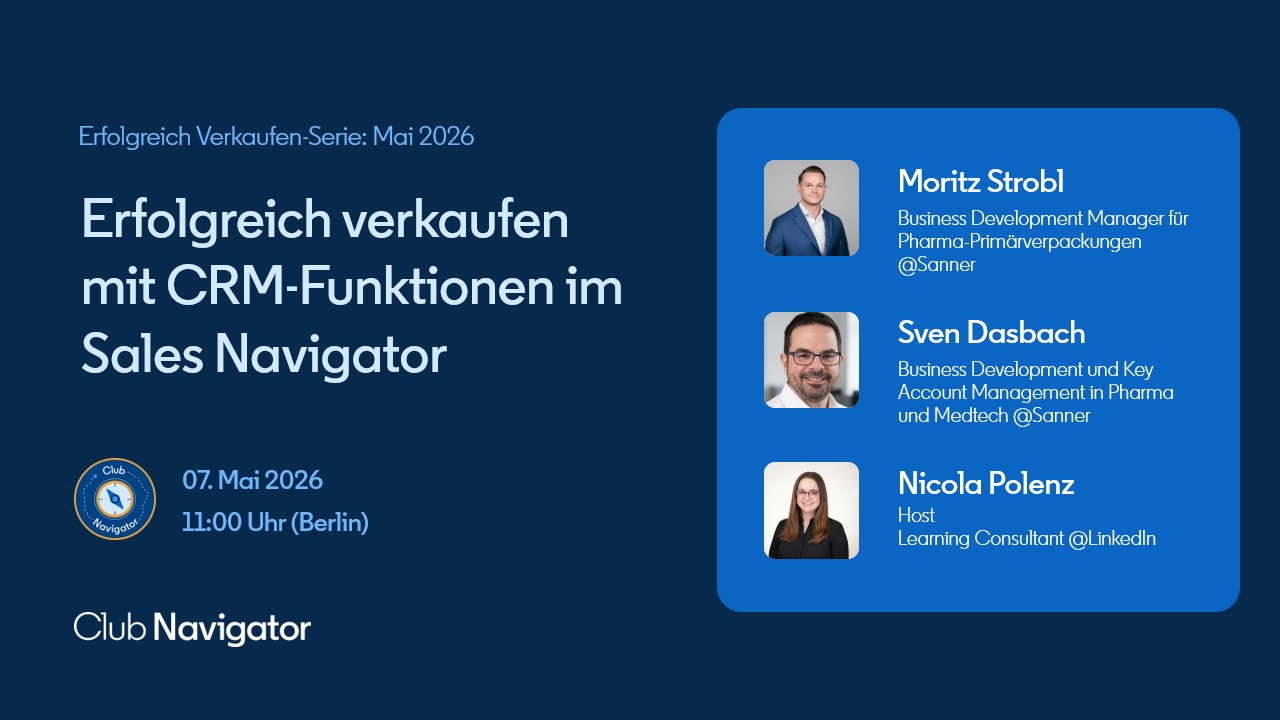 Live-Webinar-Serie, die zeigt, wie du Sales Navigator mit verschiedenen Funktionen gezielt einsetzt, um deine Vertriebsarbeit effizienter und wirkungsvoller zu gestalten.